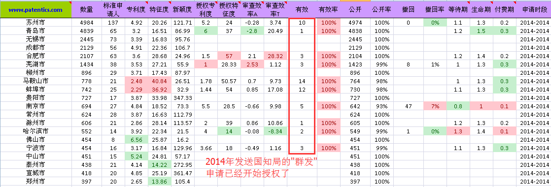 显然,青岛为“群发”水平最高城市,65个申请人(实际61),从来没有申请中国发明专利,2014年”群发”4839(实际4691)篇发明申请给国知局。